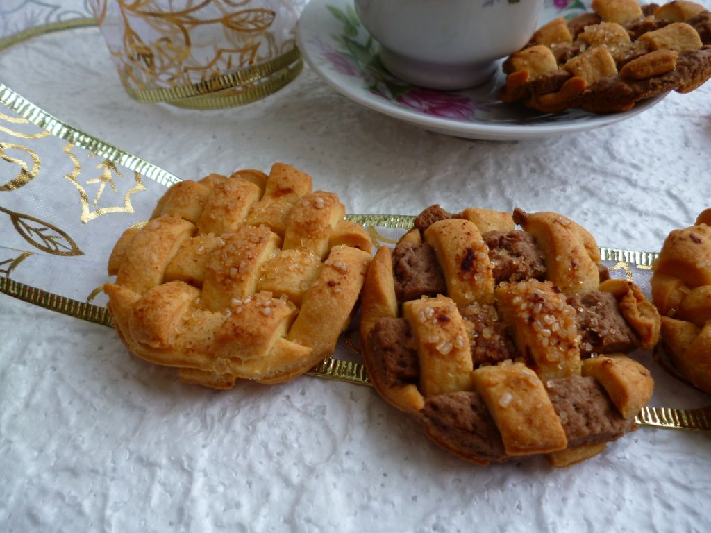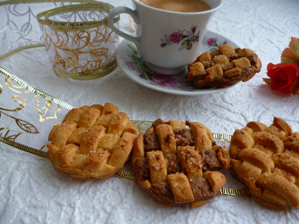 Mąkę mieszamy z proszkiem do pieczenia i cukrem. Mąką wysypujemy na stolnicę, dodajemy zimne masło i siekamy nożem aż do powstania grudek. Następnie dodajemy jajko, wodę i zagniatamy ciasto. Przed zagnieceniem ciasta, dzielimy je na pół i do jednej części dodajemy kakao. Oba ciasta owijamy w folię i wkładamy do lodówki na około 1 godzinę. Po wyjęciu ciasta z lodówki rozwałkowujemy je na placek grubości 3mm i kroimy w paski (grubość wedle uznania). Paski przeplatamy ze sobą na przemian jasne i ciemne tworząc kratkę.