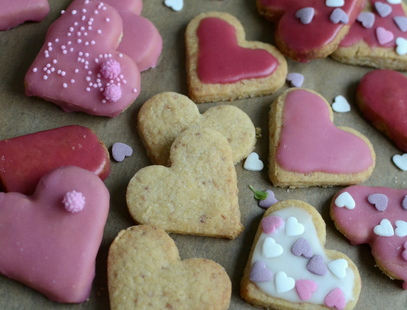 Po tym czasie ciasto rozwałkowujemy na grubość około 5 mm i wycinamy foremką kształt serca. Ciasteczka pieczemy w 180 stopniach około 10 minut. Po upieczeniu studzimy i polewamy lukrem, można również udekorować cukrowymi ozdobami. Ciastko odstawiamy, żeby lukier stężał. Tradycyjny biały lukier otrzymamy przez ucieranie cukru pudru z mlekiem. Cukier puder dodajemy stopniowo (np. po 1 łyżce). Można dodać kilka kropel dowolnego aromatu. Lukier czerwony otrzymamy ucierając sok malinowy z cukrem pudrem. Lukier różowy uzyskamy ucierając mleko zmieszane z sokiem malinowym z cukrem pudrem. Życzę smacznego 🙂