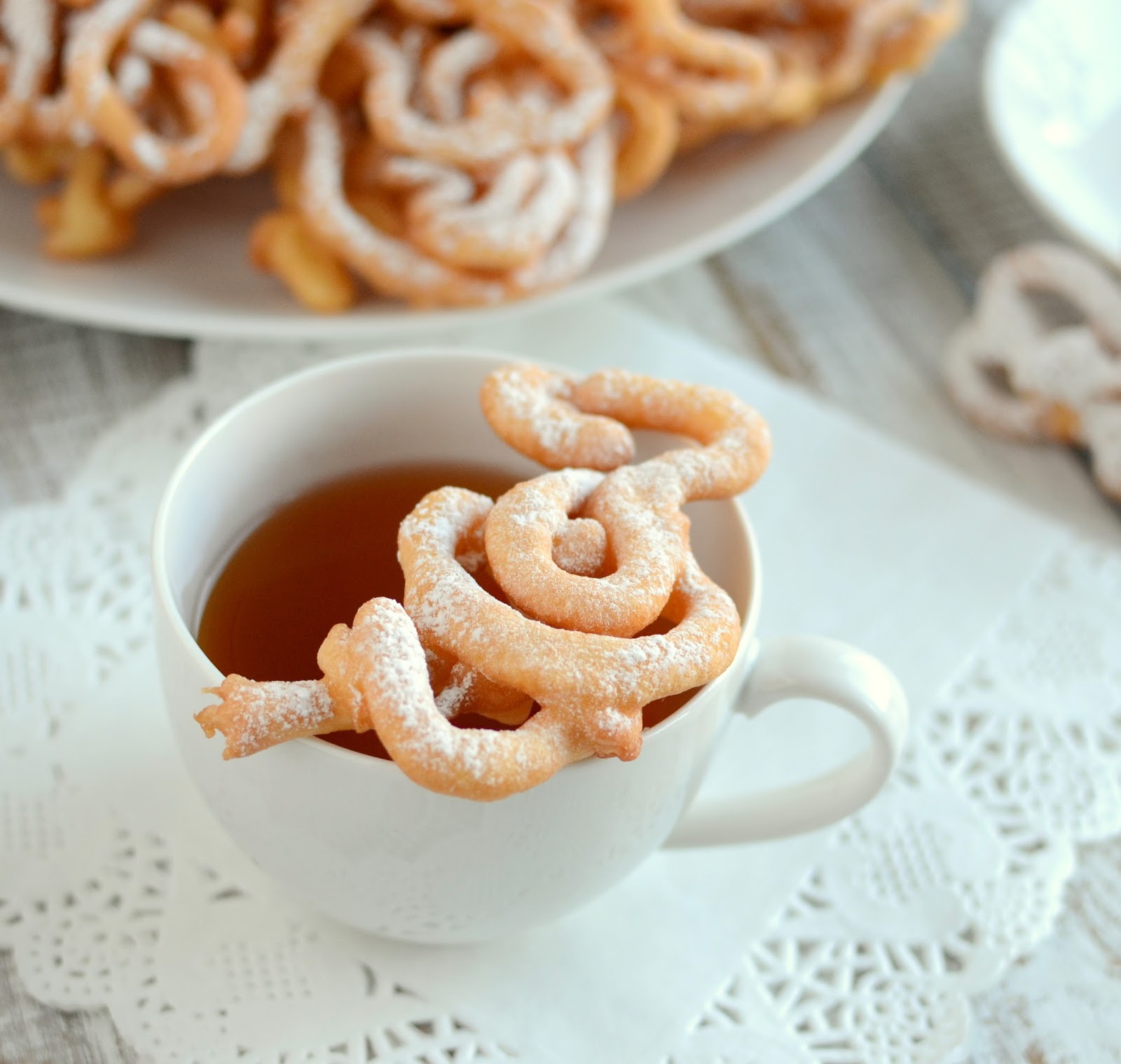 Ciasto przekładamy np. do butelki z małym otworem. Ja posłużyłam się szprycą z końcówką do nabijania pączków. Ciasto lejemy na rozgrzany olej tworząc wzory. Smażymy z obu stron na rumiano na średnim ogniu. Odsączamy na papierowych ręcznikach. Po usmażeniu oprószamy cukrem pudrem.