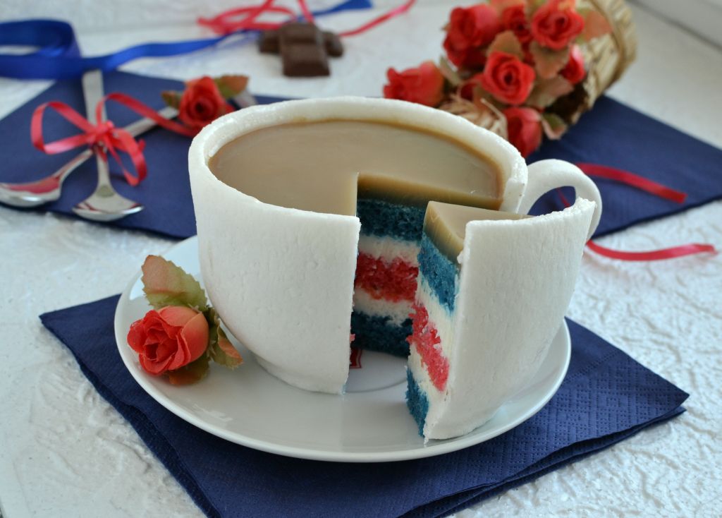 Przygotowujemy krem. Śmietanę ubijamy na sztywną pianę dodając cukru pudru do smaku. Następnie dodajemy aromat cytrynowy i mascarpone, wszystko dokładnie mieszamy. Na talerzyku układamy najmniejszy z niebieskich krążków. Smarujemy go kremem. Układamy na nim krążek czerwony, dajemy krem i kładziemy krążek niebieski. Pozostałym kremem obkładamy brzegi ciasta. Z podanych proporcji wyszły mi 2 filiżanki. Ciasto jest dosyć wilgotne więc nie należy nasączać niczym upieczonych, kolorowych ciast Przełożone kremem ciasto wstawiamy do lodówki, a w tym czasie przygotowujemy masę cukrową. Jeżeli filiżanka nie wyszła nam zbyt równa można wyciąć jej kształt obcinając ciasto nożem.