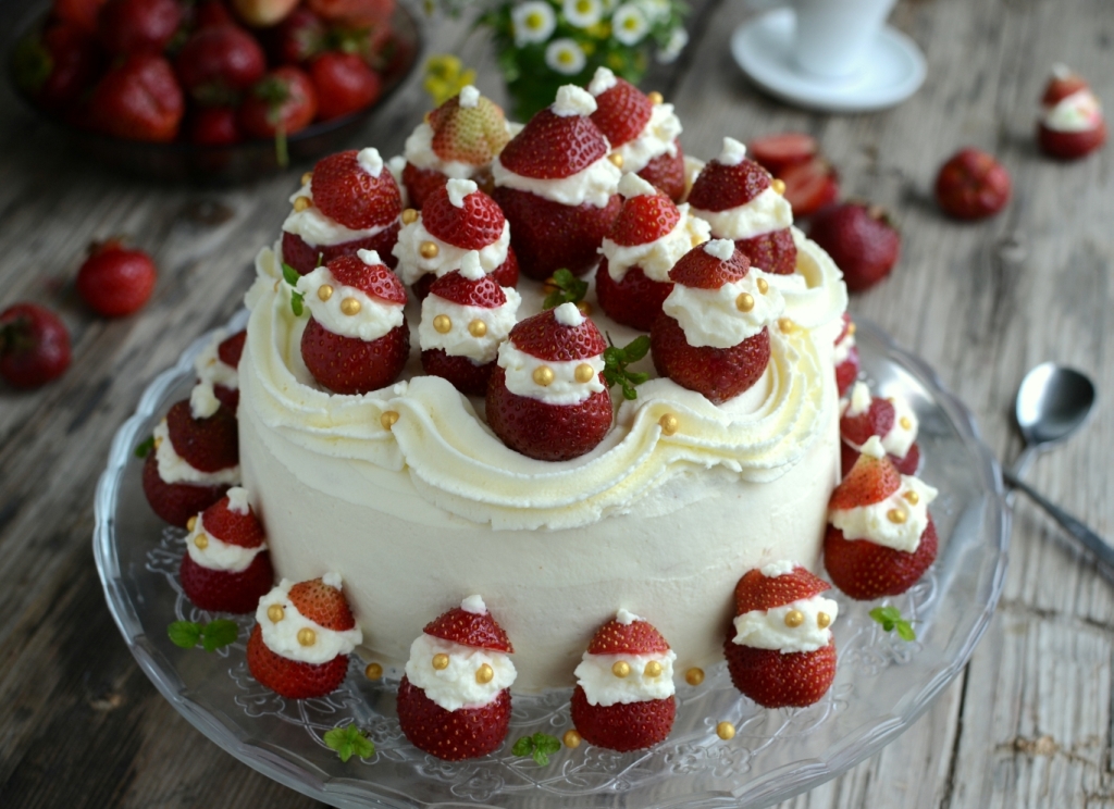 Witam bardzo słonecznie w "Weekendowej Cukierence" 😉 Ponieważ truskawki już się kończą, sezon postanowiłam zakończyć efektownym ciastem z truskawkami w roli głównej. Mikołaje z truskawek chodziły mi po głowie już od dłuższego czasu. Pierwszą myślą było upieczenie babeczek i postawienie na nich truskawkowych mikołajów, ale pomysł dojrzewał kilka dni i na myśl przyszło mi takie ciasto 🙂 Przyznam, że troszkę się przy nim napracowałam, ale efekt był tego wart. Mikołaje wszystkich zaskoczyły, buźki same się im do nich uśmiechały 🙂 Bita śmietana i truskawki to moim zdaniem jedno z najlepszych połączeń, dlatego właśnie użyłam do przełożenia ciasta takiego kremu.