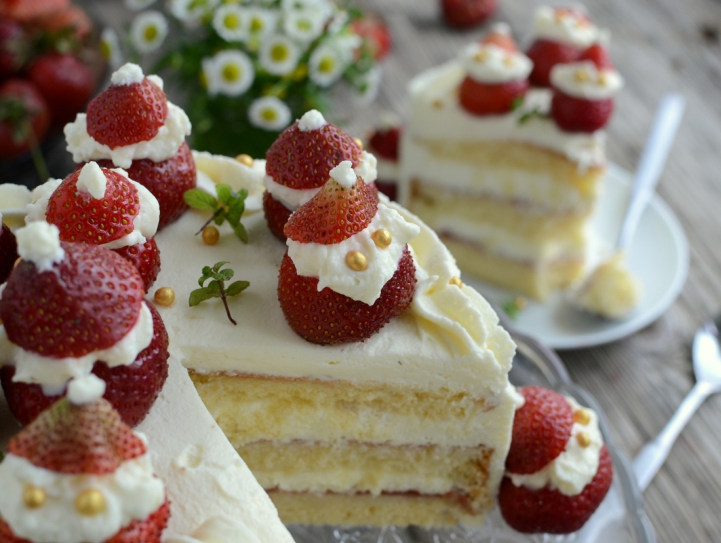 Do miski wbijamy białka i ubijamy je na sztywno z dodatkiem szczypty soli. Pod koniec ubijania dodajemy stopniowo cukier i cukier waniliowy. Następnie dodajemy po jednym żółtku i olej, miksując na najmniejszych obrotach miksera. Kolejno dodajemy stopniowo mąkę wymieszaną z proszkiem do pieczenia i mieszamy delikatnie łyżką. Masę przekładamy do wysmarowanej masłem i oprószonej bułką tartą tortownicy (18 cm). Pieczemy w 180 stopniach przez około pół godziny. Po przestudzeniu ciasto kroimy na 3 części. Wodę mieszamy z wódką i aromatem cytrynowym. Kremówkę ubijamy na sztywno, miksujemy z mascarpone, aromatem cytrynowym i dodajemy cukier puder do smaku. Na paterze układamy pierwszy blat ciasta. Nasączamy go, smarujemy dżemem truskawkowym i wykładamy 1/4 kremu. Układamy kolejną porcję ciasta i postępujemy tak samo. Układamy trzeci blat i smarujemy go kremem. Truskawki myjemy, osuszamy. Odkrawamy czubek truskawki i wypełniamy go pozostałym kremem, do każdej truskawki wkładamy po 2 złote kulki. Truskawki układamy na cieście. Ciasto można udekorować złotymi kulkami i listkami mięty. Życzę smacznego 🙂