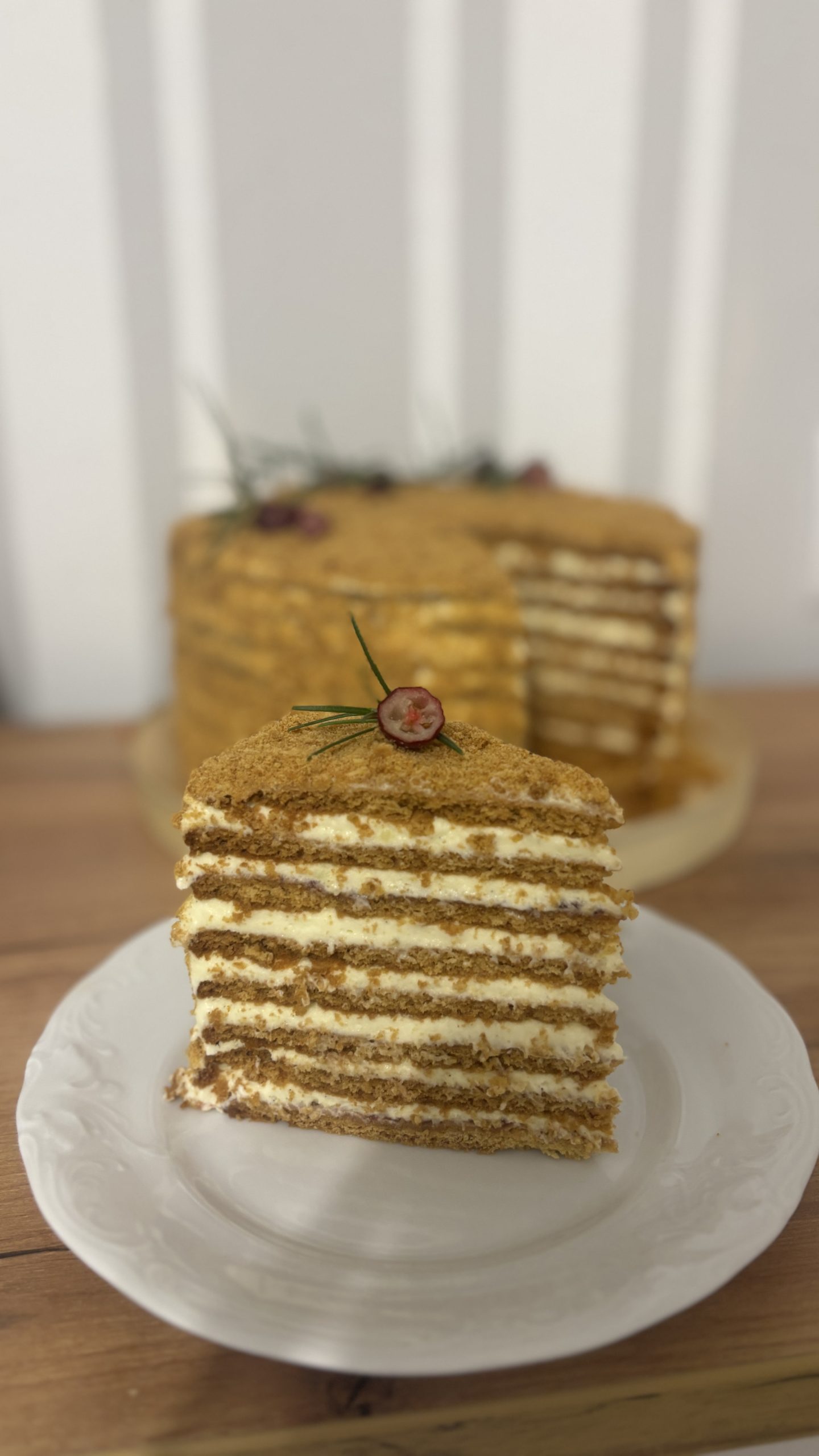 Miodownik czyli rosyjskie warstwowe ciasto miodowe uznawane jest za jedno z najsmaczniejszych ciast na świecie. Jest bardzo popularne w Rosji i pieczone najczęściej na imprezy urodzinowe dzieci. Mamy tutaj 8 miodowych blatów przełożonych pysznym kremem. Początkowo miodowe blaty są twarde. Ale już po 1 dniu miękną i łączą się w całość, w jedno przepyszne ciasto. A z każdym dniem ciasto nabiera głębszego smaku. Ciasto smakuje jak mięciutki karmel. Pięknie kroi się na porcje. Bardzo dobrze przechowuje pod przykryciem do kilku dni.