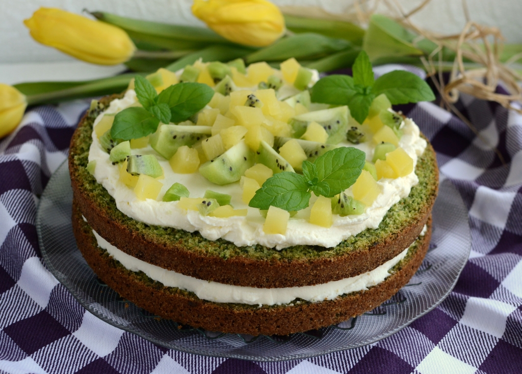 Szpinak pozostawiamy do rozmrożenia. Gdy się rozmrozi dokładnie go odciskamy i miksujemy z połową oleju. Białka oddzielamy od żółtek i ubijamy na sztywną pianę.Cały czas ubijając dodajemy partiami cukier i cukier waniliowy oraz po jednym żółtku. Następnie dodajemy stopniowo pozostały olej i proszek do pieczenia wymieszany z mąką i mieszamy już łyżką. Dodajemy szpinak i dokładnie mieszamy. Tortownicę (21cm) smarujemy masłem i obsypujemy bułką tartą. Wlewamy ciasto do formy i pieczemy około 45 minut w 180 stopniach (do suchego patyczka). Ciasto po upieczeniu studzimy i kroimy na dwie części. Kolejno przygotowujemy krem. Kremówkę ubijamy na sztywną pianę. Pod koniec ubijania dodajemy cukier puder. Następnie mieszamy ją z mascarpone i dodajemy kilka kropel aromatu cytrynowego. Kremem smarujemy plastry ciasta. Całość dekorujemy pokrojonym w kostkę ananasem i kiwi. Życzę smacznego 🙂