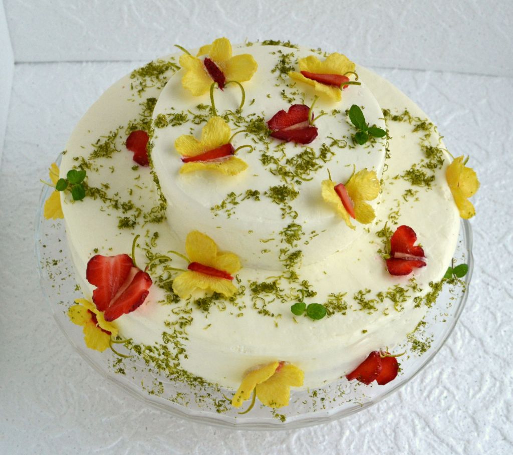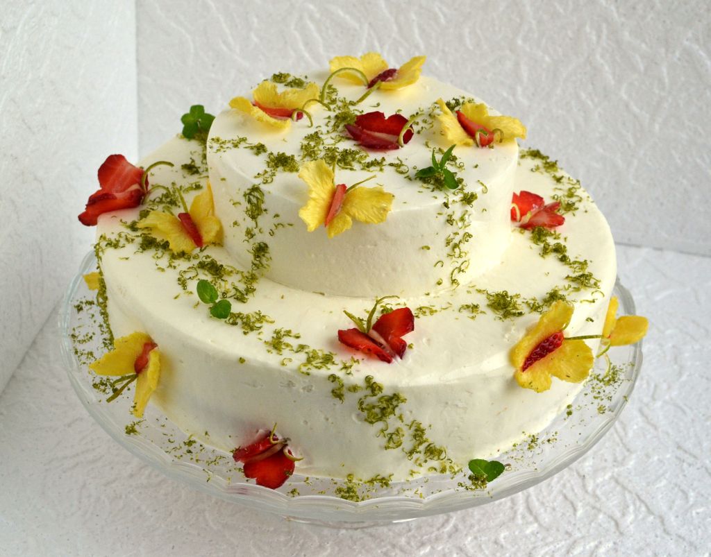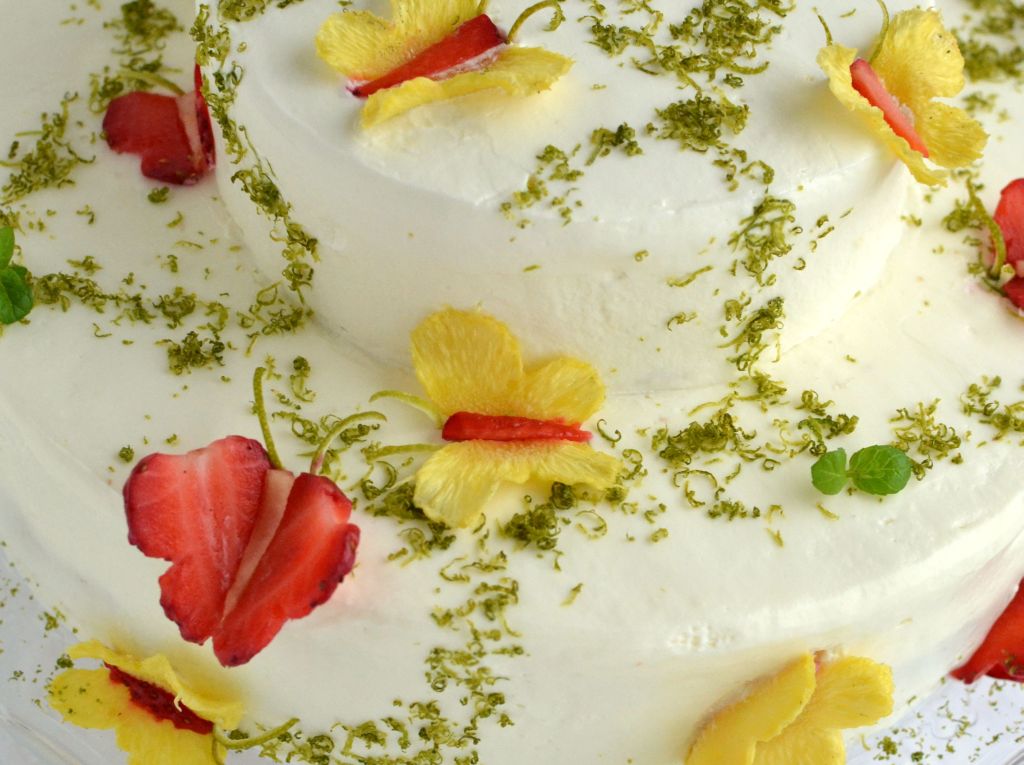 Na blasze układamy folię aluminiową. Skrzydełka smarujemy masłem i układamy na folii. Wstawiamy do piekarnika i suszymy w temperaturze 50 stopni około godziny (najlepiej w piekarniku z termo obiegiem lub po prostu lekko uchylamy drzwi normalnego piekarnika). Ananas powinien się wysuszyć i nabrać pięknego, żółtego koloru. Truskawki kroimy na cienkie plastry i wycinamy z nich skrzydełka. Z resztek ananasa wycinamy tułowia czerwonych motyli. Tułowia czerwone wycinamy z truskawek. Limonki sparzamy i wycinamy z nich czułki motyli. Następnie skórkę ścieramy na tarce. Ananasa w puszce za pomocą blendera miksujemy wraz z zalewą. Żelatynę rozpuszczamy w gorącej wodzie i łączymy ze zmiksowanym ananasem. Całość odstawiamy do lodówki do momentu aż zacznie tężeć. Śmietanę kremówkę ubijamy na sztywną pianę z dodatkiem cukru waniliowego i śmietan-fixów. Na paterze układamy pierwszy biszkopt. Smarujemy go całą tężejącą masą ananasową. Przykrywamy go drugim biszkoptem i smarujemy śmietaną, przykrywamy trzecim biszkoptem. Na duże biszkopty układamy teraz mały biszkopt. Smarujemy go dżemem truskawkowym, przykrywamy drugim biszkoptem, który smarujemy śmietaną. Kładziemy ostatni biszkopt. Tort smarujemy resztą śmietany. Na torcie układamy motyle ananasowe i truskawkowe. Tort posypujemy startą skórką z limonki. Życzę smacznego 🙂