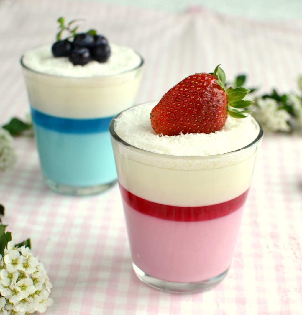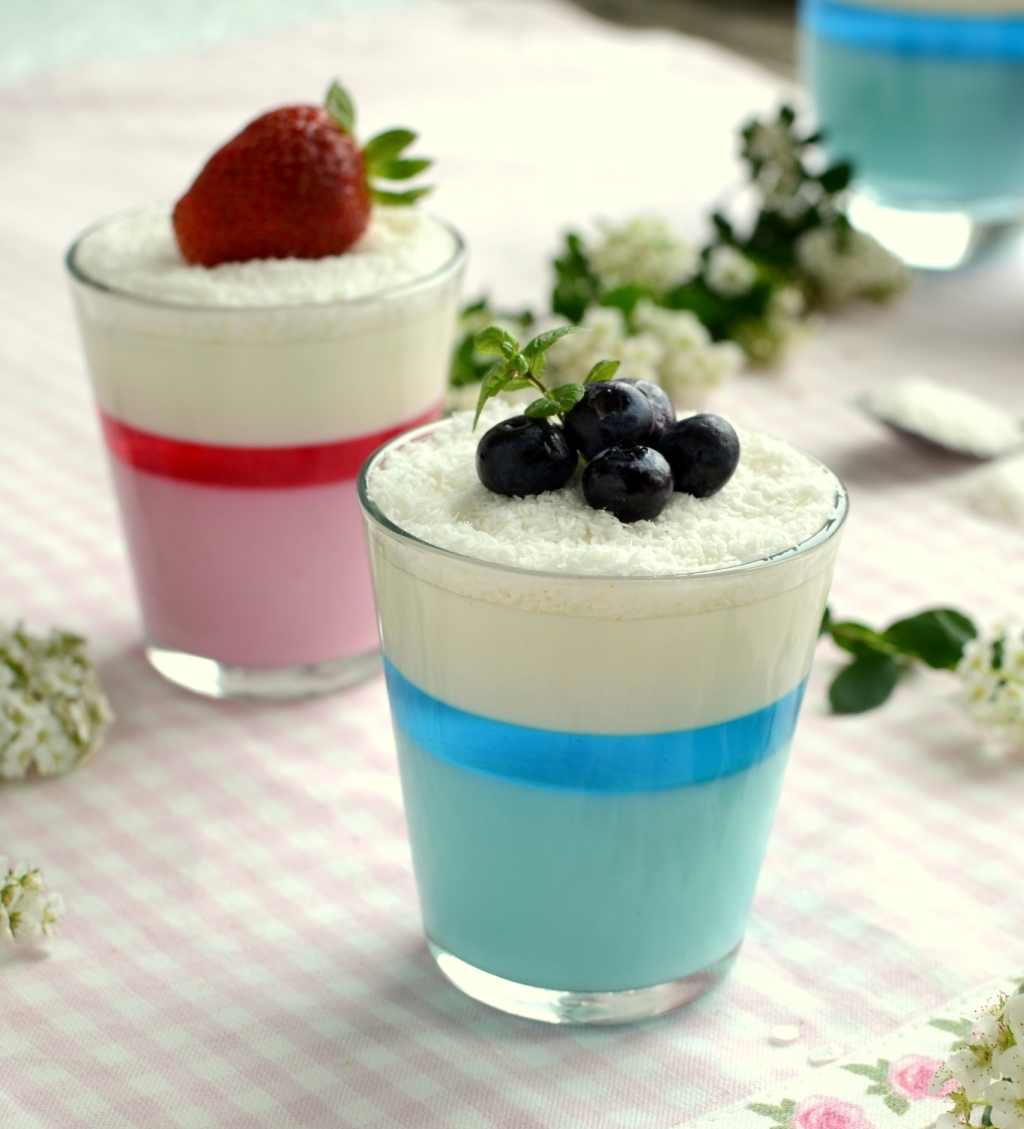 Podaję proporcję na cztery desery. Połowę galaretki niebieskiej rozpuszczamy w połowie szklanki gorącej wody. Połowę galaretki różowej rozpuszczamy w połowie szklanki gorącej wody. 100ml kefiru miksujemy dokładnie z mocno schłodzoną niebieską galaretką i przelewamy masę do szklaneczek i odstawiamy do stężenia. Podobnie postępujemy z masa różową. Pozostałą galaretkę niebieską rozpuszczamy w połowie szklanki ( analogicznie różową). Do szklaneczek wlewamy po kilka łyżeczek galaretki, aby utworzyć cienki pasek. Ponownie odstawiamy do stężenia. Do rondelka wlewamy mleko, dodajemy kremówkę, wstawiamy na ogień dodając cukru pudru do smaku. Zagotowujemy i dodajemy żelatynę. Zdejmujemy z ognia i mieszamy aż do rozpuszczenia żelatyny. Masę odstawiamy do ostudzenia, a gdy zacznie tężeć wlewamy ją do szklaneczek. Gotowe desery dekorujemy wiórkami kokosowymi i owocami. Smacznego 🙂
