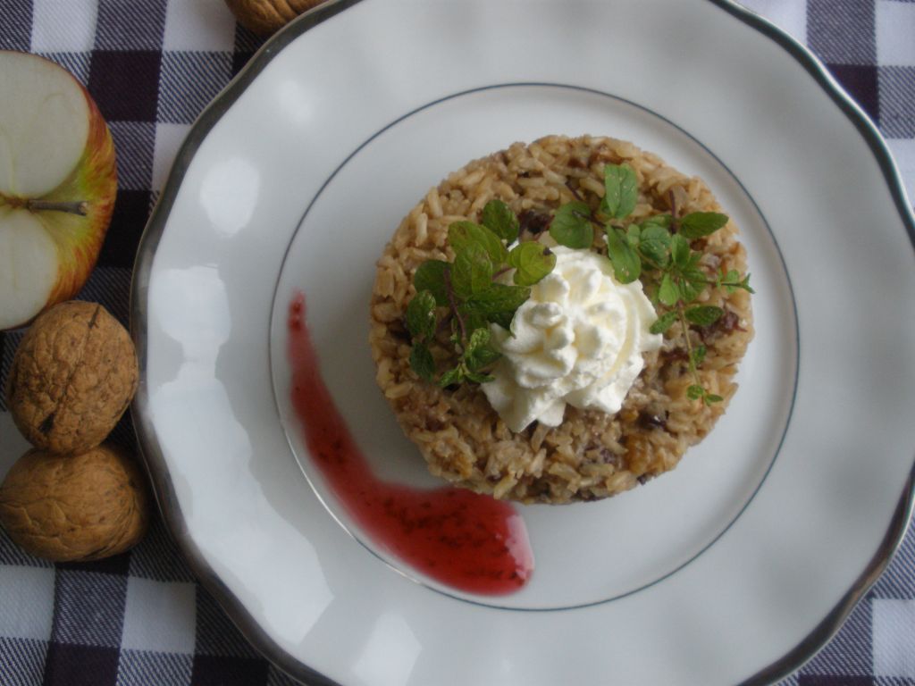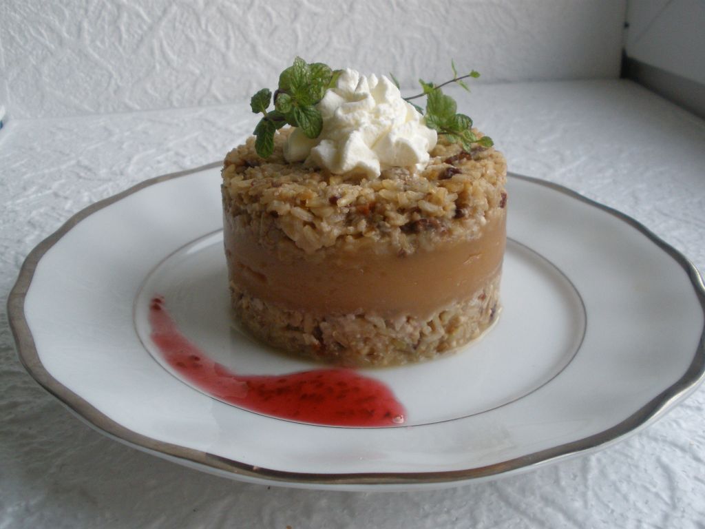 Orzechy mielimy lub kruszymy na mniejsze kawałki za pomocą tłuczka, rodzynki kroimy na mniejsze kawałki. Wystudzony ryż łączymy z orzechami, rodzynkami i miodem. Całość dokładnie mieszamy. Na talerzyku stawiamy pierścień. Wykładamy połowę masy orzechowej i dokładnie ugniatamy. Kolejno wykładamy wystudzone jabłka i lekko dociskamy. Odstawiamy na jakieś pół godziny, aby jabłka nam się "związały". Pierścień dopełniamy masą orzechową, wyrównujemy i lekko dociskamy. Całość odstawiamy do lodówki na kilka godzin.
