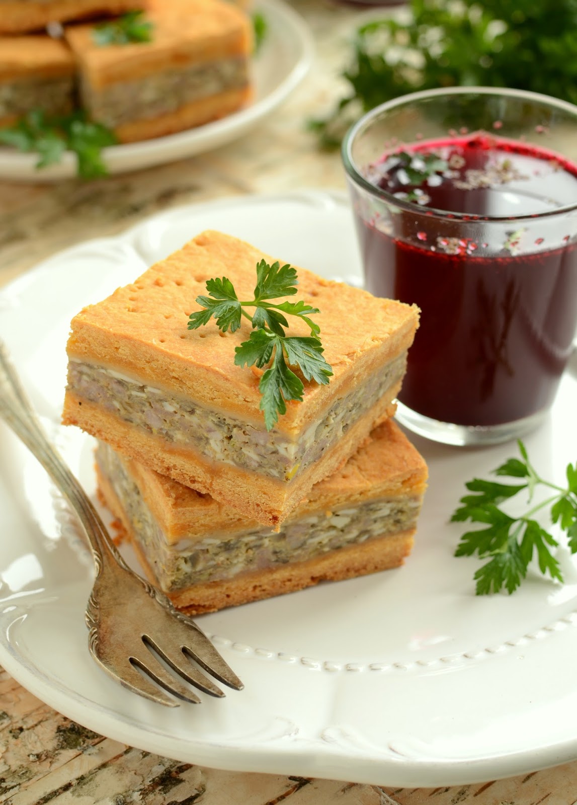 Kule z ciasta zawijamy w folię i chłodzimy w lodówce przez co najmniej godzinę. Po tym czasie jedną z części ciasta rozwałkowujemy i wykładamy na blaszkę o wymiarach 24x36cm. Blaszkę wykładamy papierem do pieczenia. Ciasto nakłuwamy gęsto widelcem i chłodzimy jeszcze chwilkę. W tym czasie piekarnik nagrzewamy do 180 stopni. Zimne ciasto wkładamy do gorącego piekarnika i pieczemy 15 minut. Podpieczony spód wyjmujemy i rozkładamy na nim farsz. Na farsz wykładamy drugą rozwałkowaną część ciasta. Delikatnie dociskamy ciasto do farszu. Ciasto górne również nakłuwamy widelcem. Całość pieczemy 1h w 180 stopniach. Gdyby ciasto zaczęło się spiekać to przykrywamy je folią aluminiową w trakcie pieczenia.