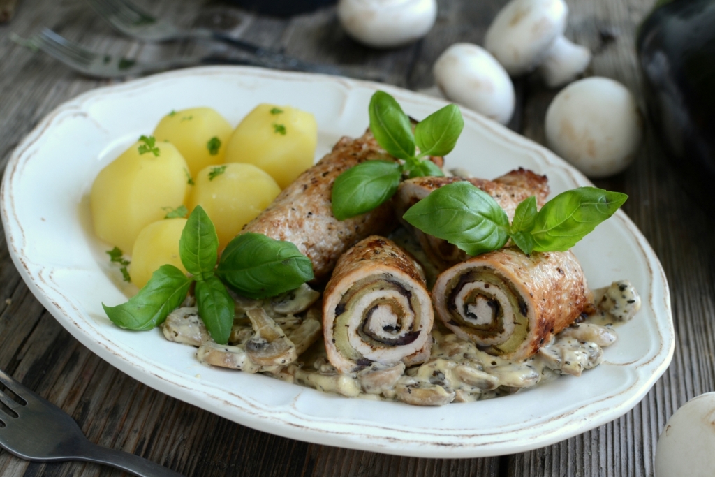 Bakłażana kroimy w cienkie plastry. Solimy je z obu stron i odstawiamy na 15 minut, a później osuszamy papierowymi ręcznikami. Następnie skrapiamy go sokiem z cytryny i oliwą, oprószamy pieprzem. Grillujemy go z obu stron na patelni grillowej. Należy pamiętać, żeby nie dawać zbyt dużo jakiegokolwiek tłuszczu, bo bakłażan mocno go chłonie. Schab rozbijamy na cienkie kotlety, solimy i pieprzymy z obu stron. Następnie z jednej strony oprószamy go słodką papryką i ziołami prowansalskimi, układamy po 1-2 plastry grillowanego bakłażana i zwijamy roladki. Roladki smażymy na rumiano na oleju na wolnym ogniu. Pod koniec smażenia dodajemy łyżkę masła, roladki wtedy nabiorą ładnego, złotego koloru. Pieczarki kroimy w półplasterki (mniejsze w plasterki). Na patelni rozgrzewamy masło, dodajemy pieczarki i smażymy je na złoty kolor. Gdy pieczarki będą prawie gotowe dodajemy bazylię oraz sól i pieprz do smaku. Do pieczarek dodajemy śmietanę i całość jeszcze chwilkę smażymy na wolnym ogniu. Roladki podałam z młodymi ziemniakami na sosie pieczarkowym udekorowane świeżą bazylią. Życzę smacznego 🙂