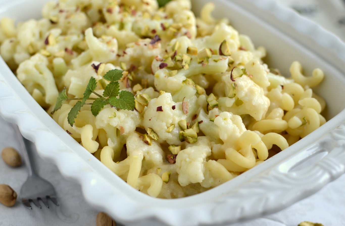 Dodajemy do niej wodę z gotowania kalafiora. Zagotowujemy i do całości dodajemy śmietanę. Dokładnie mieszamy uważając, aby śmietana się nie zważyła. Kolejno dodajemy żółty ser i gotujemy chwilkę na wolnym ogniu, aż ser się rozpuści. Doprawiamy do smaku solą, pieprzem ziołowym i gałką. Do sosu dodajemy różyczki kalafiora, dokładnie mieszamy, aż sos je pokryje. Na talerz wykładamy porcję makaronu, polewamy sosem i posypujemy posiekanymi pistacjami. Życzę smacznego 🙂
