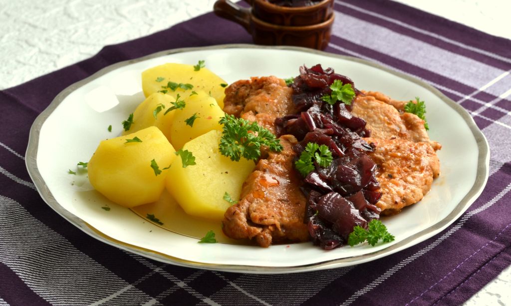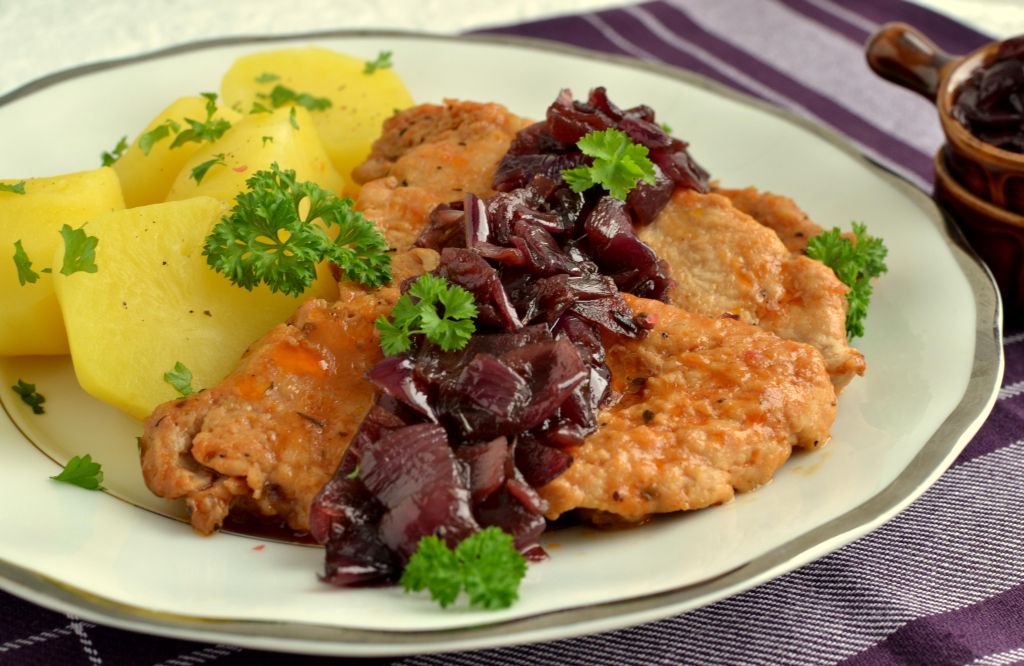 Schab kroimy na cztery kotlety i rozbijamy lekko najlepiej przez folię. Następnie obtaczamy je w mące i podsmażamy na rumiano z obu stron. Do kotletów wlewamy bulion, dodajemy koncentrat pomidorowy i dusimy pod przykryciem na wolnym ogniu około 40 minut. W między czasie doprawiamy solą i pieprzem do smaku. Konfiturę z czerwonej cebuli przygotowujemy wg mojego przepisu. Na talerz wykładamy bitki i układamy na nich porcję konfitury z cebuli. Życzę smacznego 🙂