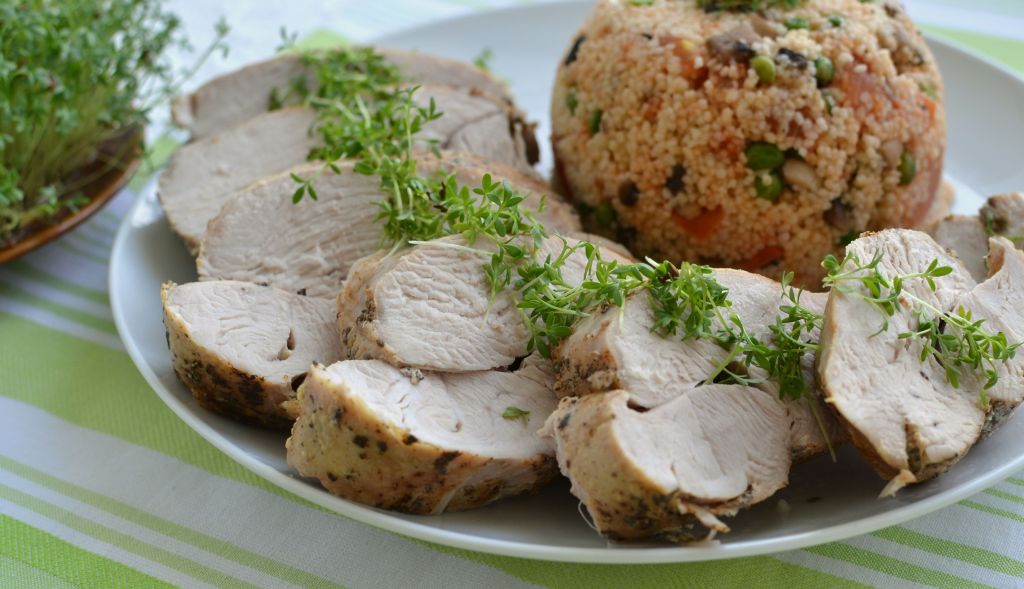 Kuskus przygotowujemy według przepisu na opakowaniu. Pieczarki obieramy i kroimy w kostkę. Podsmażamy je na tłuszczu dodając groszek. Pod koniec smażenia dodajemy pokrojonego w kostkę pomidora, doprawiamy do smaku. Dodajemy kuskus i całość mieszamy. Gotowego indyka podajemy pokrojonego w plastry z kuskusem z warzywami. Smacznego 😉