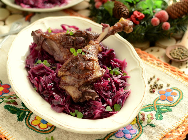 Kaczkę podajemy na ciepło na kapuście. Jako dodatek proponuję pieczone ziemniaczki lub kluski.