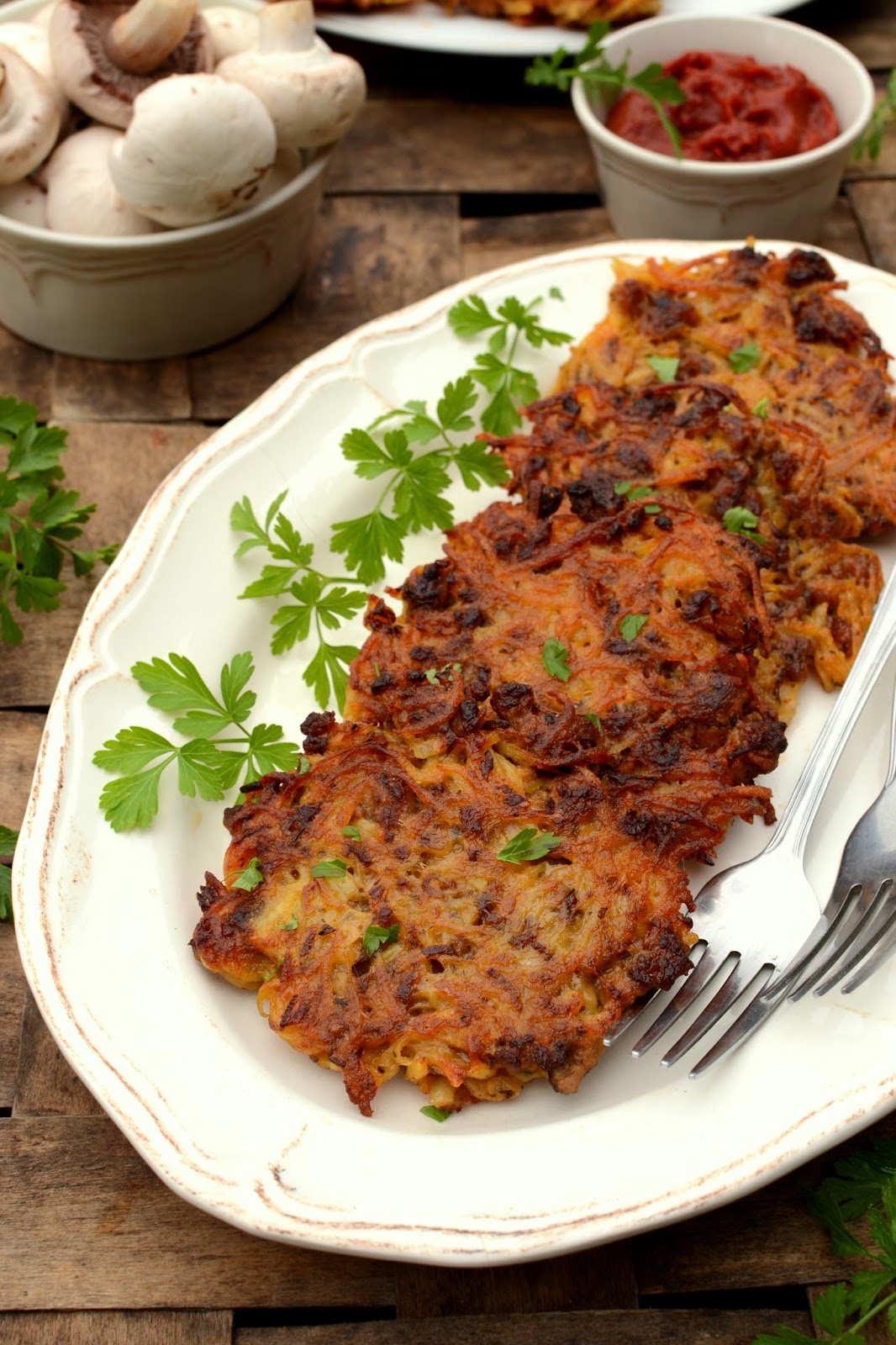 Smażymy do momentu aż z pieczarek wyparuję wodą i się zarumienią. Wówczas dodajemy mięso mielone. Smażymy razem aż mięso się zarumieni. Dodajemy przeciśnięty przez praskę czosnek, słodką i ostrą paprykę, majeranek i ketchup. Dokładnie mieszamy i dusimy razem kilka minut. Mięso doprawiamy solą i pieprzem do smaku, studzimy. W tym czasie ziemniaki obieramy i ścieramy na grubych oczkach tarki. Odciskamy sok i przekładamy je do miski. Do miski dodajemy podsmażone mięso, resztę cebuli, mąkę i jajko, mieszamy. Na patelni rozgrzewamy olej i łyżką nakładamy porcję masy mięsno-ziemniaczanej. Smażymy cienkie placki na rumiano. Placki podajemy na ciepło z ulubionym sosem.