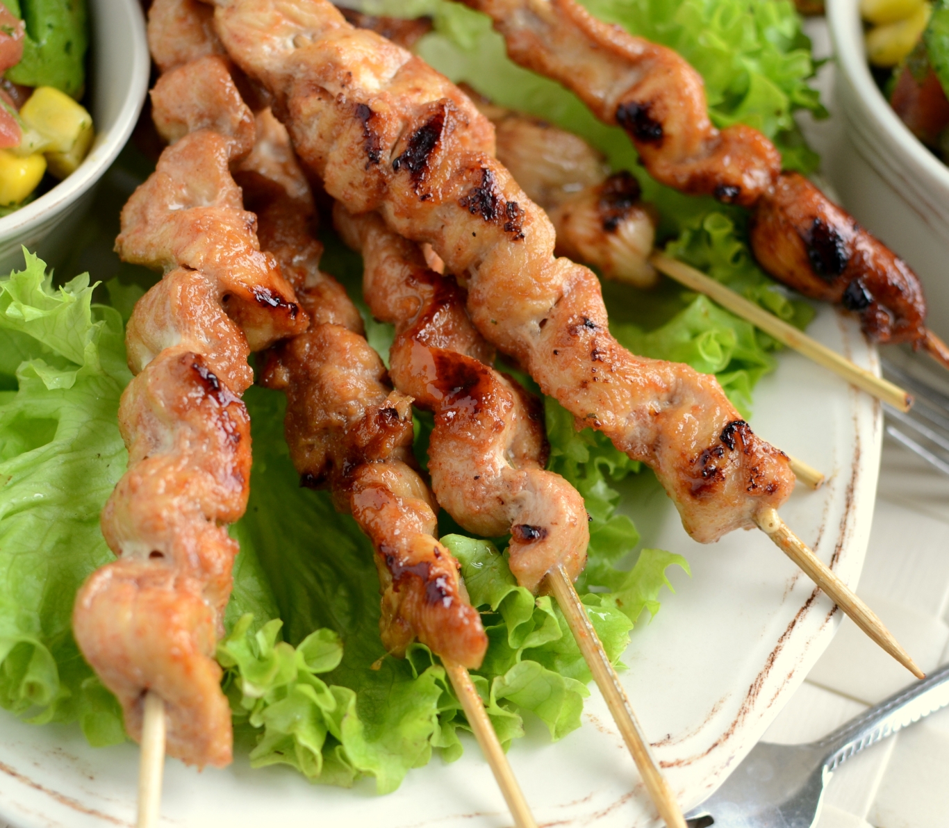 Patyczki do szaszłyków moczymy przez 30 minut w letniej wodzie. Składniki marynaty mieszamy ze sobą. Kurczaka płuczemy i osuszamy. Następnie kroimy go w cienkie paseczki. Mięso wkładamy do miski, zalewamy przygotowaną marynatą i odstawiamy do lodówki na całą noc.