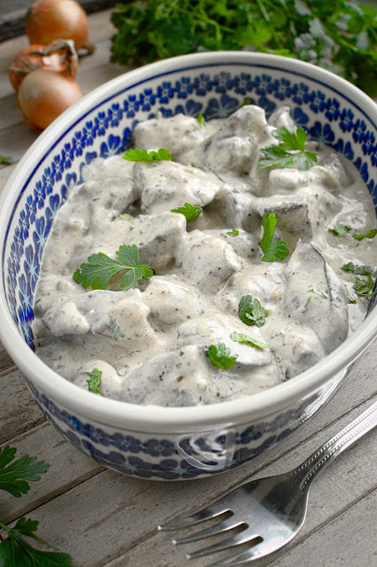 Dodajemy musztardę, zioła, patelnię przykrywamy i całość dusimy około 10 minut na wolnym ogniu pod przykryciem. Następnie wlewamy śmietanę, mieszając całość zagotowujemy. Przyprawiamy do smaku solą i pieprzem. Danie zdejmujemy z ognia i posypujemy natką pietruszki. Podajemy z ziemniakami z wody lub pieczywem.