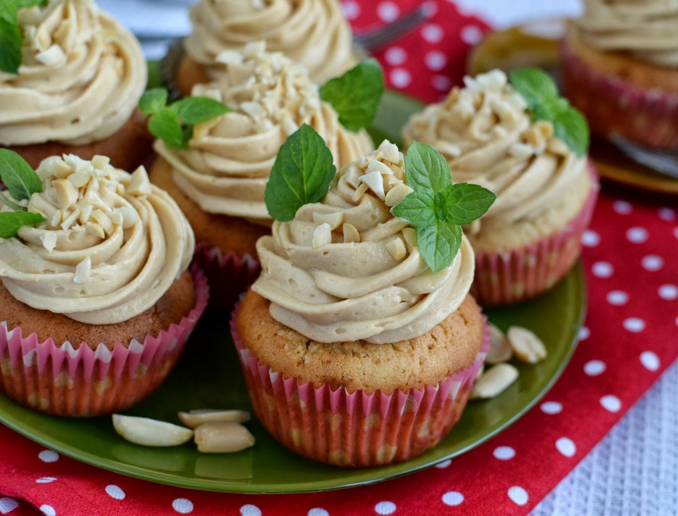 Po upieczeniu babeczki studzimy. W tym czasie przygotowujemy krem. Masło ucieramy z masłem orzechowym. Następnie dodajemy kremówkę i cukier puder, dokładnie mieszamy. Masę przekładamy do szprycy i dekorujemy nią babeczki. Babeczki posypujemy orzeszkami i ozdabiamy listkami mięty, smacznego 😉