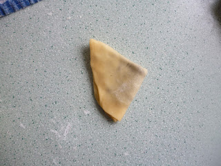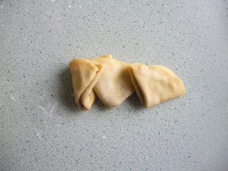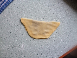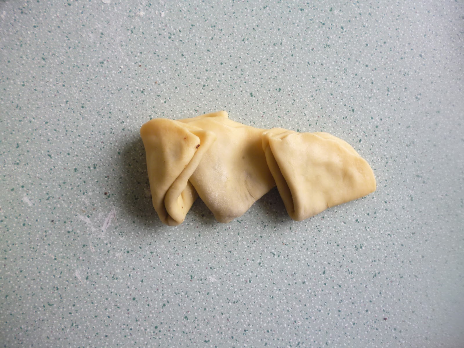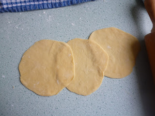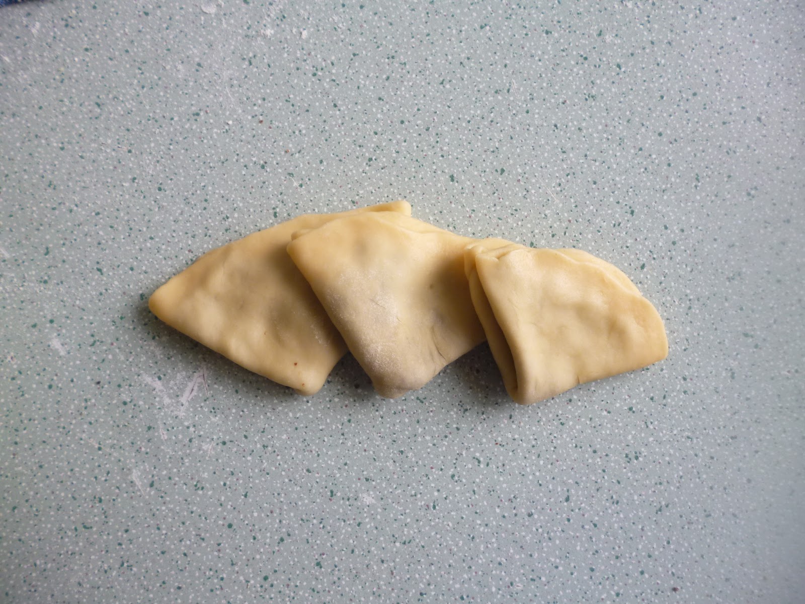 Każdą kulkę dzielimy na 3 równe części i rozwałkowujemy je na cienkie, okrągłe placki (nie będą one zbyt duże – rozwałkowujemy najcieniej jak się da).