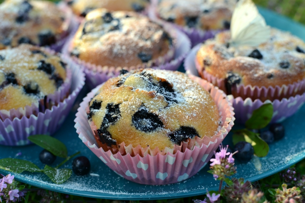 Delikatnie mieszamy. Masę przekładamy do formy wypełnionej papilotkami. Muffinki pieczemy około 20 minut w piekarniku nagrzanym do 200 stopni (do zarumienienia). Podajemy oprószone cukrem pudrem. Można dodatkowo udekorować świeżymi jagodami i listkami jagód. Życzę smacznego 🙂