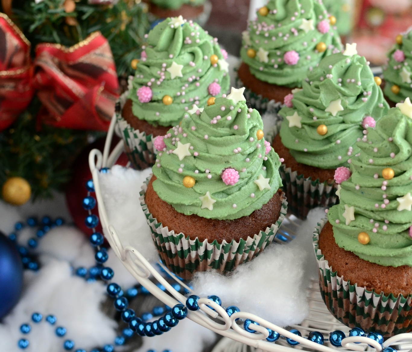 KREM: Kremówkę ubijamy na sztywną pianę, pod koniec ubijania dodajemy cukier puder. Następnie dodajemy mascarpone, olejek migdałowy i zielony barwnik spożywczy i miksujemy na wolnych obrotach miksera do połączenia się składników. Masę przekładamy do szprycy z końcówką o kształcie gwiazdki i nakładamy krem na babeczki. Muffinki dekorujemy i przechowujemy w lodówce. Ponieważ ozdoby cukrowe (cukrowe perełki) rozpuszczają się od kremu najlepiej babeczki udekorować kilka godzi przed podaniem. Smacznego 😉