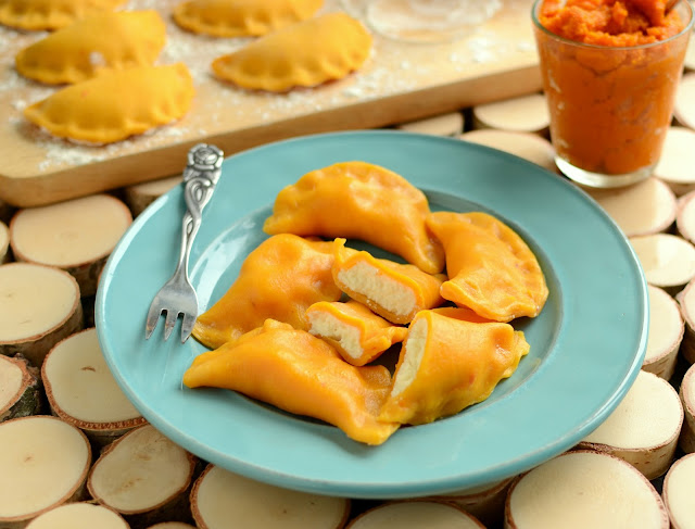 Moja rodzina nie mogła się nadziwić tym pierogom 🙂 Pierogi nie muszą być zawsze takie same. Do pierogowego ciasta dodałam dyniowego puree i uzyskałam najlepsze pierogi pod słońcem 🙂 Pysznie smakują i mają ten piękny żółciutki kolor. Rozweselą Was w najbardziej pochmurne jesienne dni.