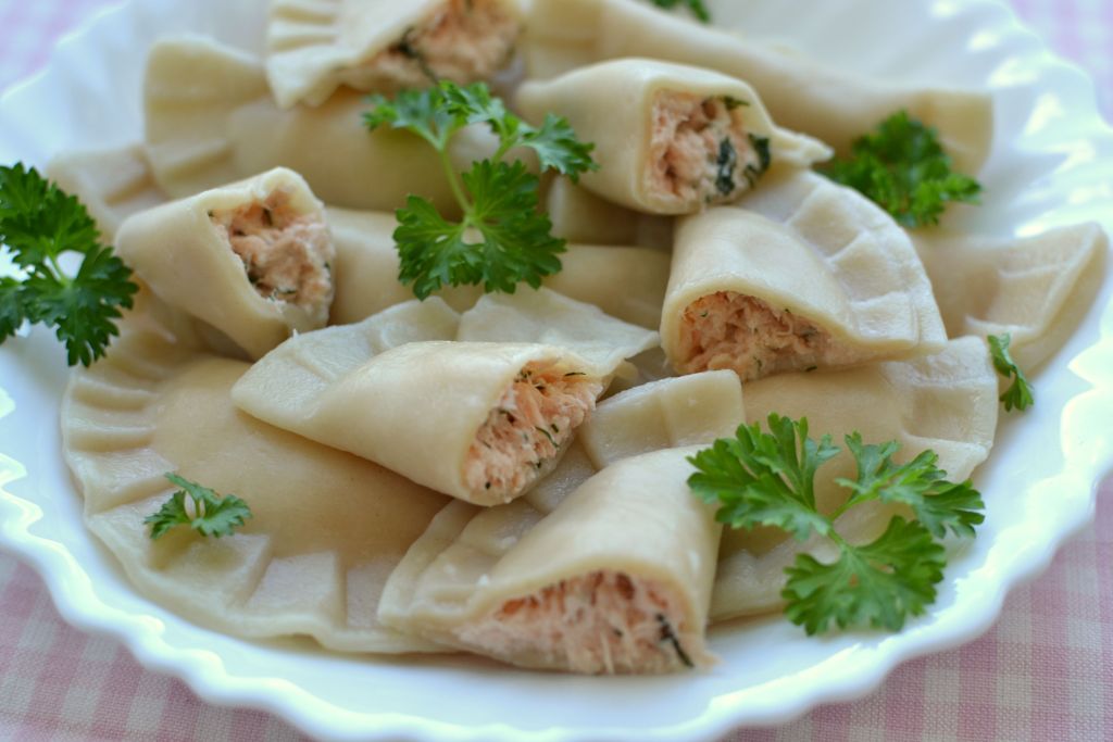 Skoro dziś piątek to zapraszam Was na pierogi z łososiem. Bardzo mile zaskoczyły mnie swoim smakiem. Są bardzo kremowe, lekkie i bardzo świeżo wyglądają na talerzu. Polecam jej Wam gorąco 🙂 A w weekend poczęstuje Was bardzo słodkimi pierożkami 🙂