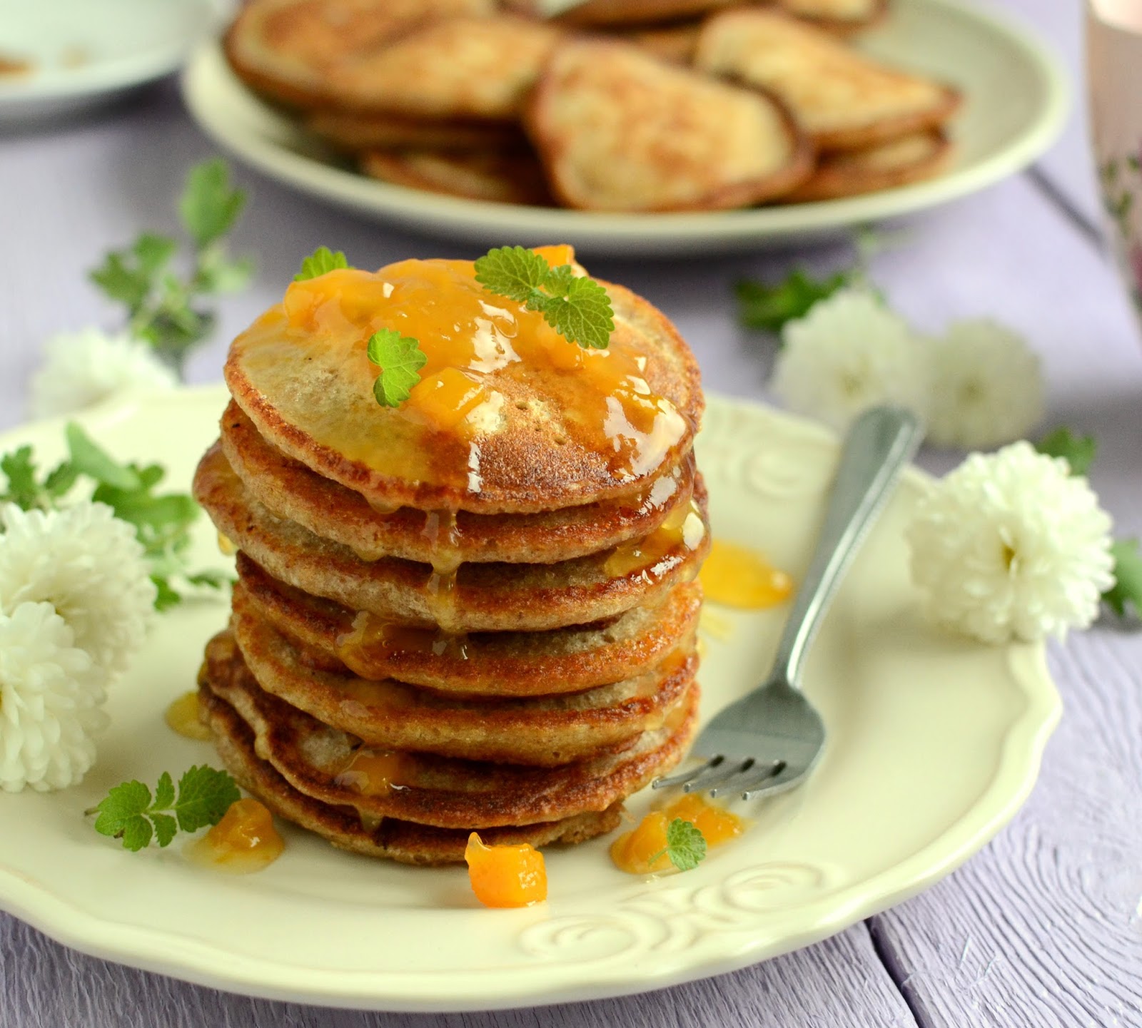 Białka ubijamy na sztywną pianę, delikatnie mieszamy z pozostałą masą. Na patelni rozgrzewamy olej, nakładamy łyżką porcję ciasta i smażymy placuszki. Placuszki podajemy na ciepło np. z dżemem brzoskwiniowym - wystarczy dżem przełożyć do garnuszka, podgrzać go i polać nim placuszki. Życzę smacznego 🙂