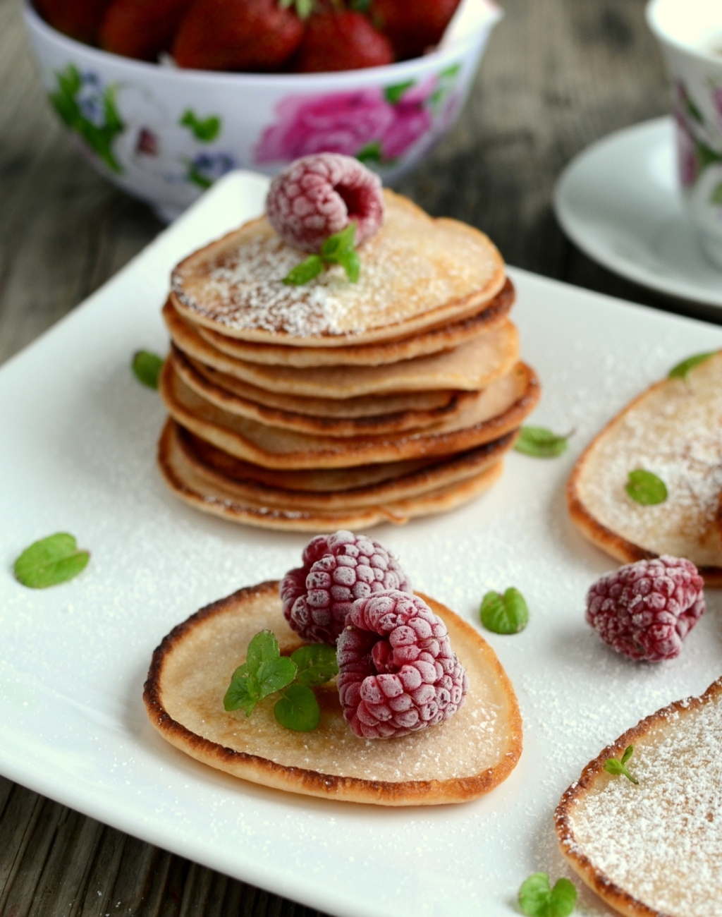 Na patelni rozgrzewamy odrobinę oleju. Łyżką nakładamy placuszki i smażymy z obu stron na rumiano. Placuszki podajemy oprószone cukrem pudrem. Na każdym placuszku układamy jedną malinę. Niestety, ja miałam tylko mrożone, ale polecam świeże maliny.