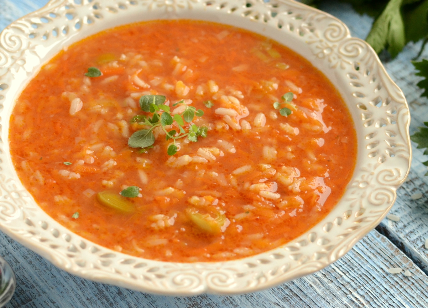 Witam Was Kochani po krótkiej przerwie 🙂 Zapraszam Was dzisiaj na pyszną, lekką zupę, która kojarzy mi się z dzieciństwem. Pamiętam jak gotowała ją mama, gdy bolał nas brzuszek. Uwielbiam ją za ten pomidorowy smak i kolor.Jest dość szybka do przygotowania, można do niej dodać rozdrobnione mięso, na którym się gotowała, dzięki temu będzie bardziej sycąca.