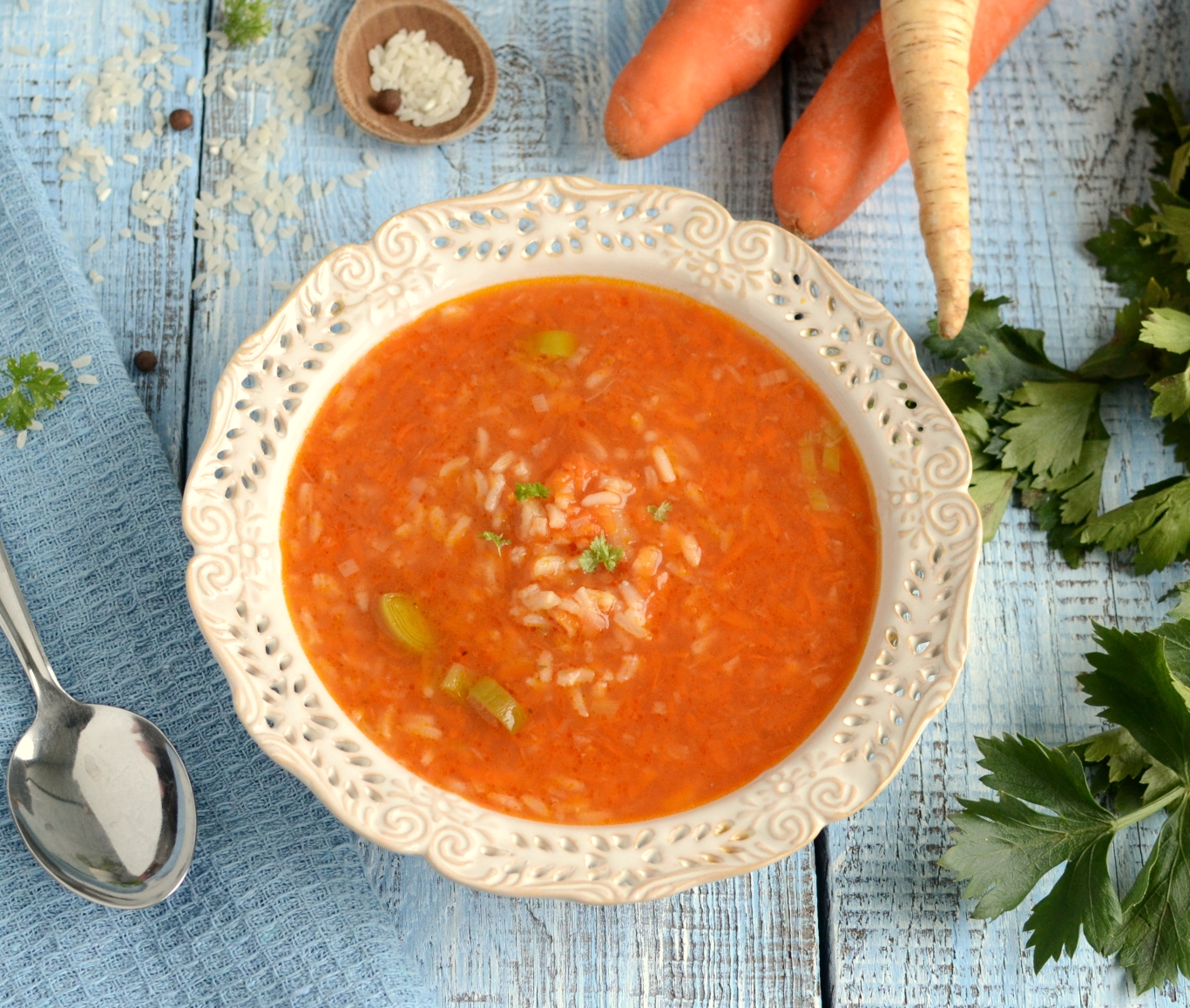 W tym czasie marchewki, seler i pietruszkę ścieramy na grubych oczkach tarki, zaś pora kroimy w talarki. Do zupy wsypujemy sypki ryż, dorzucamy warzywa i gotujemy do miękkości warzyw i ryżu, około 15-20 minut. Pod koniec do zupy dodajemy koncentrat i przyprawy. Zupę podajemy samą lub z pieczywem. Życzę smacznego 🙂
