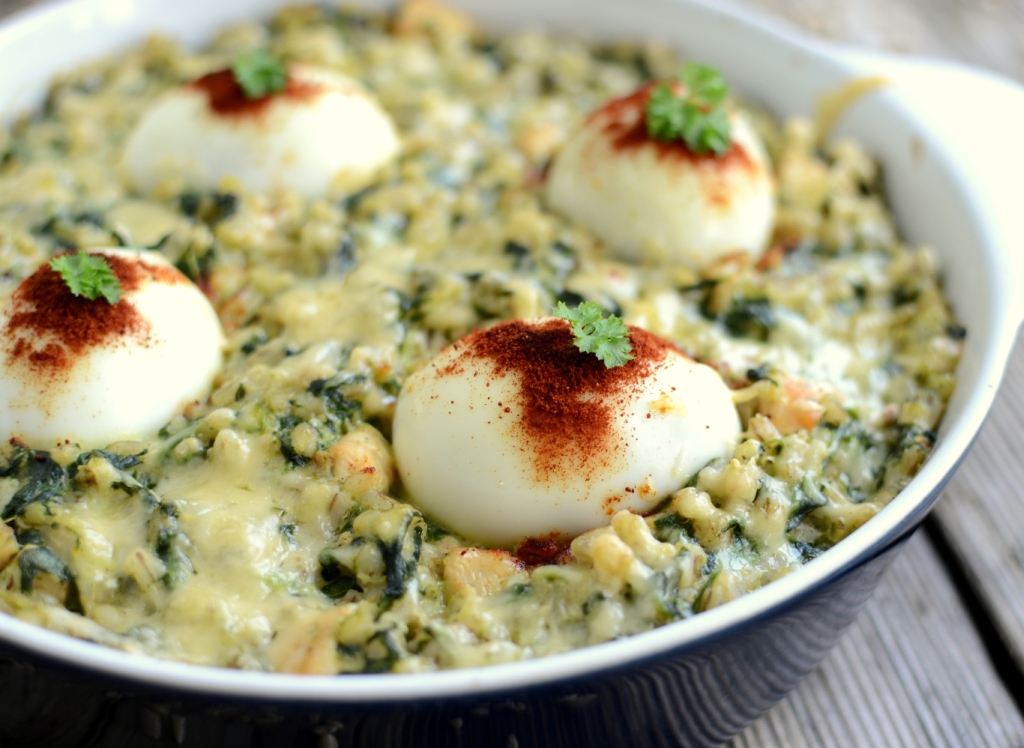Następnie dodajemy jajko wymieszane ze śmietaną i 3/4 sera i całość po wymieszaniu przekładamy do żaroodpornej formy. W masie robimy cztery wgłębienia, w których układamy ugotowane na twardo jajka. Każde z jajek posypujemy słodką papryką. Zapiekankę posypujemy pozostałym serem i zapiekamy w piekarniku nagrzanym do 190 stopni przez 15-20 minut. Życzę smacznego 😉