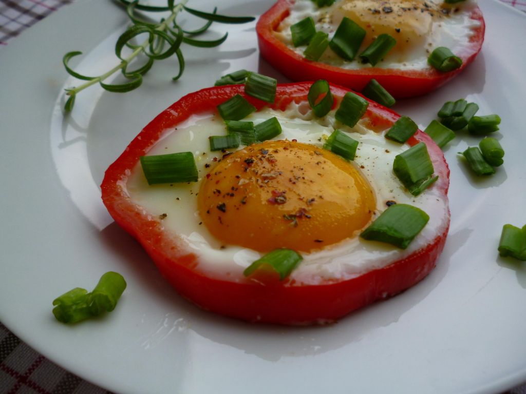 Paprykę myjemy. Następnie wycinamy z niej obręcze o grubości 0,5-1 cm. Aby papryka nie była zbyt twarda blanszujemy ją we wrzątku około 1 minutę. Po wyjęciu z wody paprykę osuszamy. Na patelni rozpuszczamy 1 łyżeczkę masła i wkładamy przygotowane obręcze. Do obręczy wbijamy jajko. Staramy się, aby żółtko było w środku obręczy - możemy dodać najpierw białko, a później wlać żółtko. Przykrywamy patelnię i smażymy aż do ścięcia się jajka. Jajko podajemy ze świeżym pieczywem posypane posiekanym szczypiorkiem. Życzę smacznego 🙂