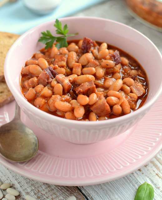 Fasolę dokładnie płuczemy pod bieżącą wodą. Przekładamy ją do dużej miski i zalewamy zimną wodą. Moczymy ją przez noc. Następnego dnia fasola odcedzamy, przekładamy do rondla i zalewamy zimną wodą. Dodajemy szczyptę soli i fasolę gotujemy przez 30 minut od momentu zagotowania. Fasolę odcedzamy i przekładamy do dużego naczynia żaroodpornego (wywar z gotowania fasoli zachowujemy). Cebule obieramy i razem z boczkiem kroimy w kostkę, czosnek przeciskamy przez praskę. Do fasoli dodajemy wszystkie składniki i dokładnie mieszamy. Fasolę zalewamy 3 szklankami wody z jej gotowania, mieszamy. Woda powinna zakryć fasolę.