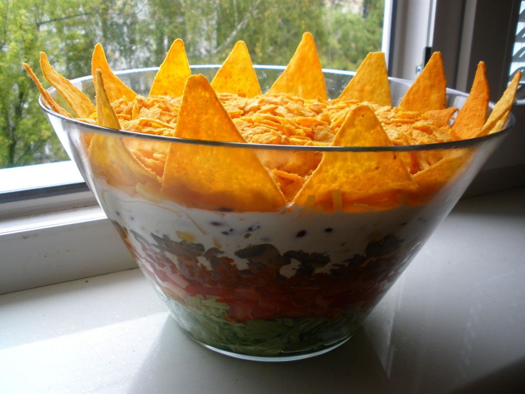 Przedstawiam Wam pomysł na bardzo widowiskową sałatkę, a jednocześnie bardzo pożywną - znajdziecie w niej wszytsko: od warzyw po mięso i chipsy. Z pewnością zakoczycie nią gości, zrobi furorę na imprezach i prywatkach. To mój zdecydowany hit w sezonie imprezowym 🙂