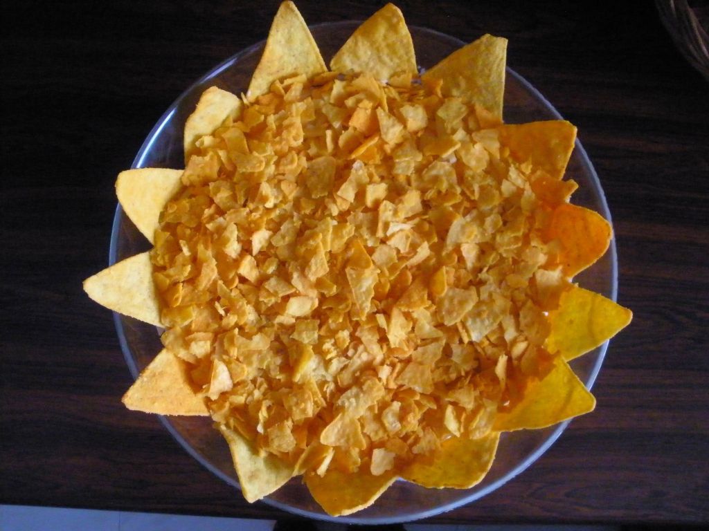 Na pieczarkach układamy odsączoną z zalewy kukurydzę, a następnie fasolę. Jogurt naturalny mieszamy z majonezem, doprawiamy solą i pieprzem do smaku. Tak przygotowanym sosem polewamy sałatkę. Ser ścieramy na grubych oczkach tarki lub kroimy w zapałki. Posypujemy nim sałatkę. Z chipsów układamy koronę, a resztę kruszymy posypując sałatkę. Sałatkę wstawiamy do lodówki na kilka godzin do przegryzienia. Życzę smacznego 😉