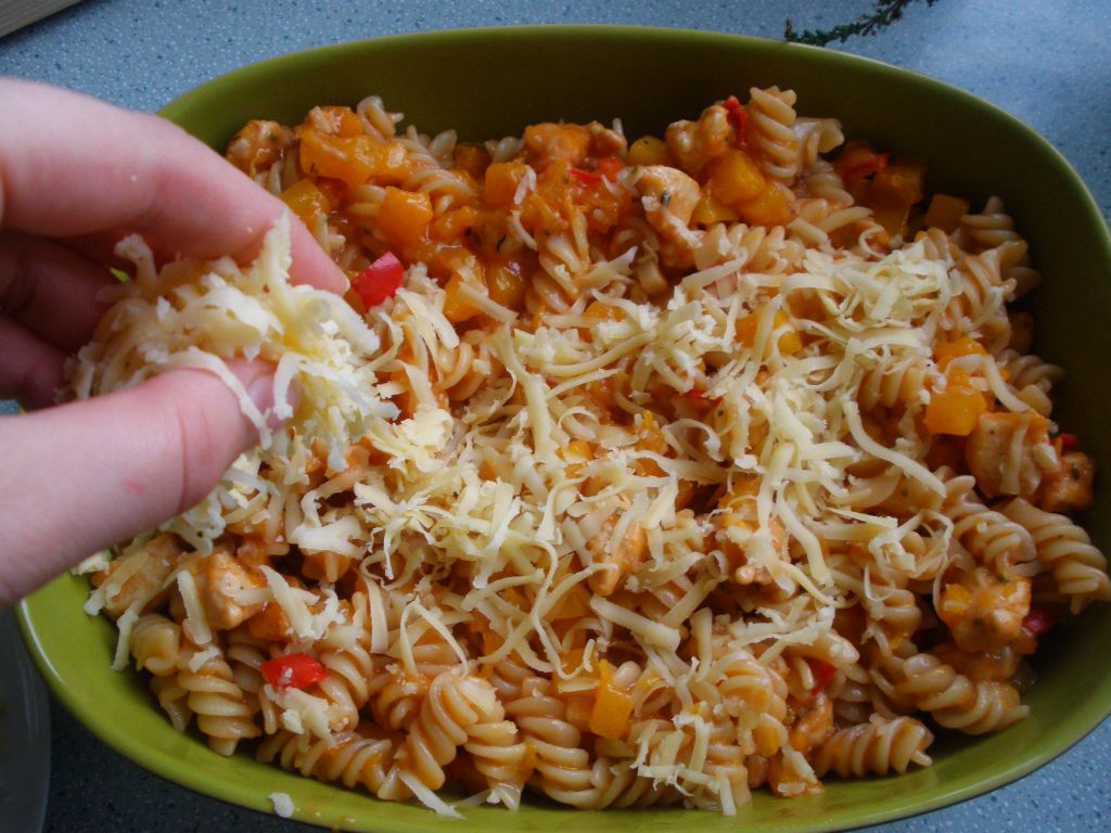 Dodajemy dynię, papryczkę i czosnek, podsmażamy do miękkości dyni, dodając soli i tymianku. Ser ścieramy na grubych oczkach tarki. Gdy dynia zaczyna się rozpadać dodajemy mleko i koncentrat pomidorowy.i 1/4 sera. Całość chwilkę jeszcze gotujemy i dodajemy kurczaka. Makaron gotujemy zgodnie z przepisem na opakowaniu. Mieszamy go z powstałym sosem. Całość przekładamy do naczynia do zapiekania i posypujemy resztą sera. Zapiekamy około 20 minut w piekarniku nagrzanym do 180 stopni. Życzę smacznego 😉