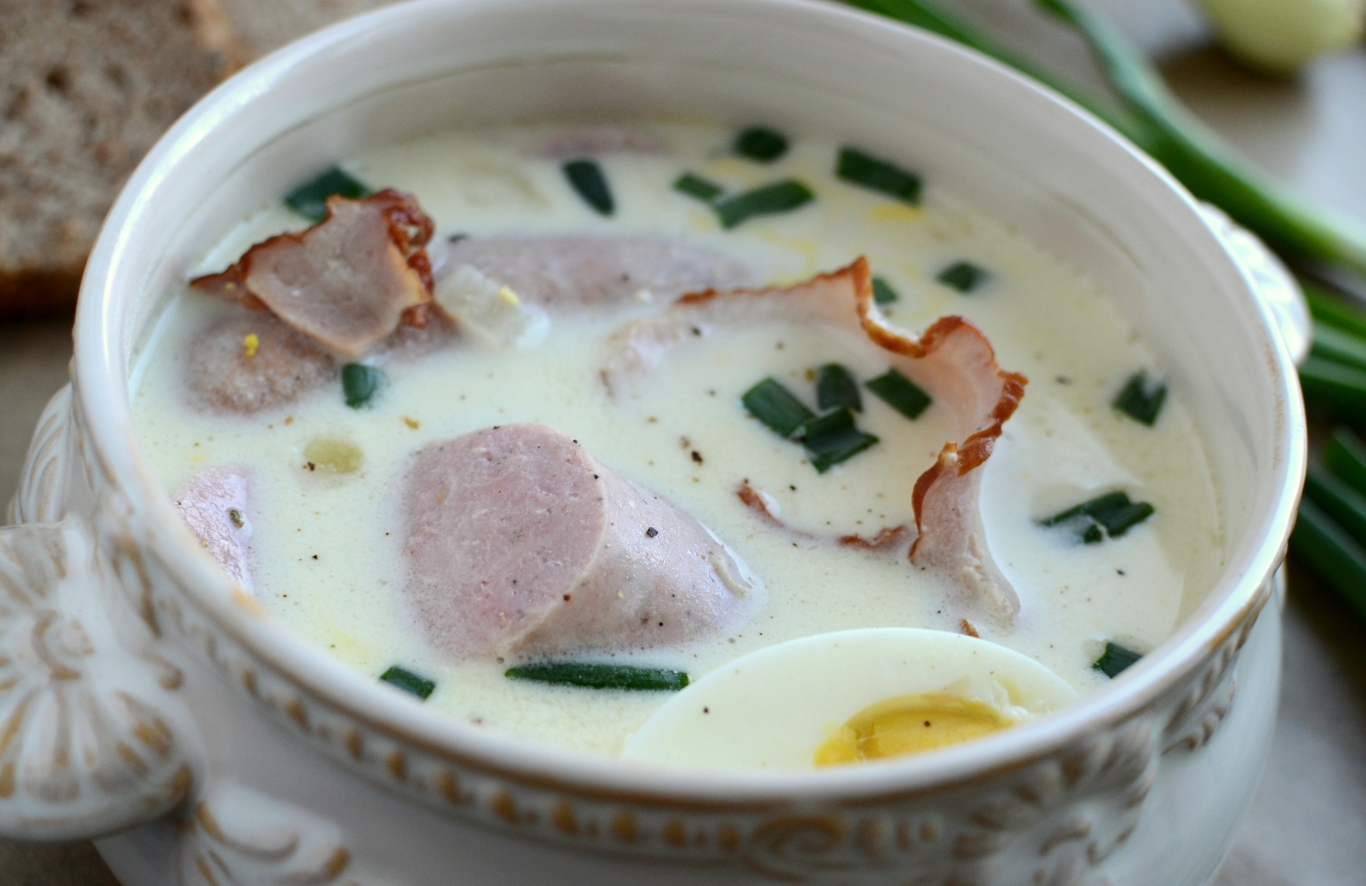 Białe kiełbasy podsmażamy na patelni. Jajka gotujemy na twardo i kroimy ćwiartki. Boczek kroimy w kostkę. na patelni szklimy pokrojoną w kostkę cebulę, po chwili dodajemy przeciśnięty przez praskę czosnek i boczek. Smażymy aż boczek się zarumieni. Do gotującej się wody dodajemy białe kiełbasy, podsmażoną cebulę i boczek oraz plasterki szynki. Dodajemy również ocet, sól i pieprz. Gotujemy razem około 10-15 minut. 5 minut przed końcem dodajemy pokrojone jajka. Śmietanę hartujemy i dodajemy do barszczu. Chwilkę jeszcze gotujemy.