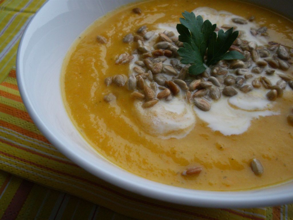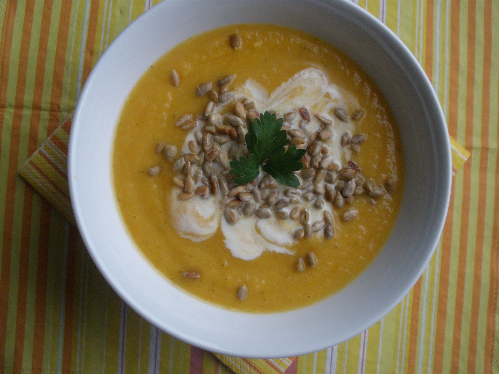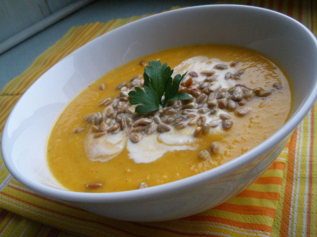 Zrobiłam taki krem z selera, marchewki i pietruszki. Podałam go dodatkowo z uprażonymi ziarnami słonecznika i kleksem śmietany. Drugi sposób podania zupy to dodanie jajka na twardo. Spróbujcie, przekonacie się, że taka zupa jest naprawdę smaczna 🙂