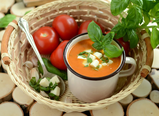 Będąc na szkoleniu w maju jadłam pyszną kremową zupę pomidorową z mozzarellą. Wiedziałam, że ją przygotuję, gdy tylko dorwę polskie pomidory. Zupa jest gęsta, mocno pomidorowa, z pachnącą bazylią i czosnkiem. Ser mozzarella dodałam dopiero na talerzyku, wówczas mięknie i delikatnie się rozpuszcza. Moim zdaniem to najlepsza zupa na lato 🙂 Poza sezonem możemy użyć pomidorów z puszki ( 3 puszki po 400g).